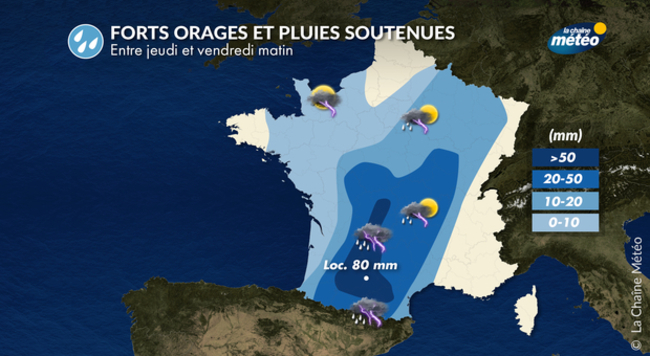 Des orages fortement pluvieux concernent Midi-Pyrénées, remontant vers le sud du Massif-Central. Ils se concentrent majoritairement sur les départements placés en alerte orange. La plaine toulousaine est concernée. Ces orages sont à nouveau fortement pluvieux jusqu'en milieu de nuit de jeudi à vendredi, en progressant lentement. Cette progression lente est propice à des pluies diluviennes. D'importants cumuls de pluie, souvent compris entre 20 et 40 mm, se généralisent, avec des accumulations maximales pouvant atteindre 30 à 70 mm sur l'épisode.